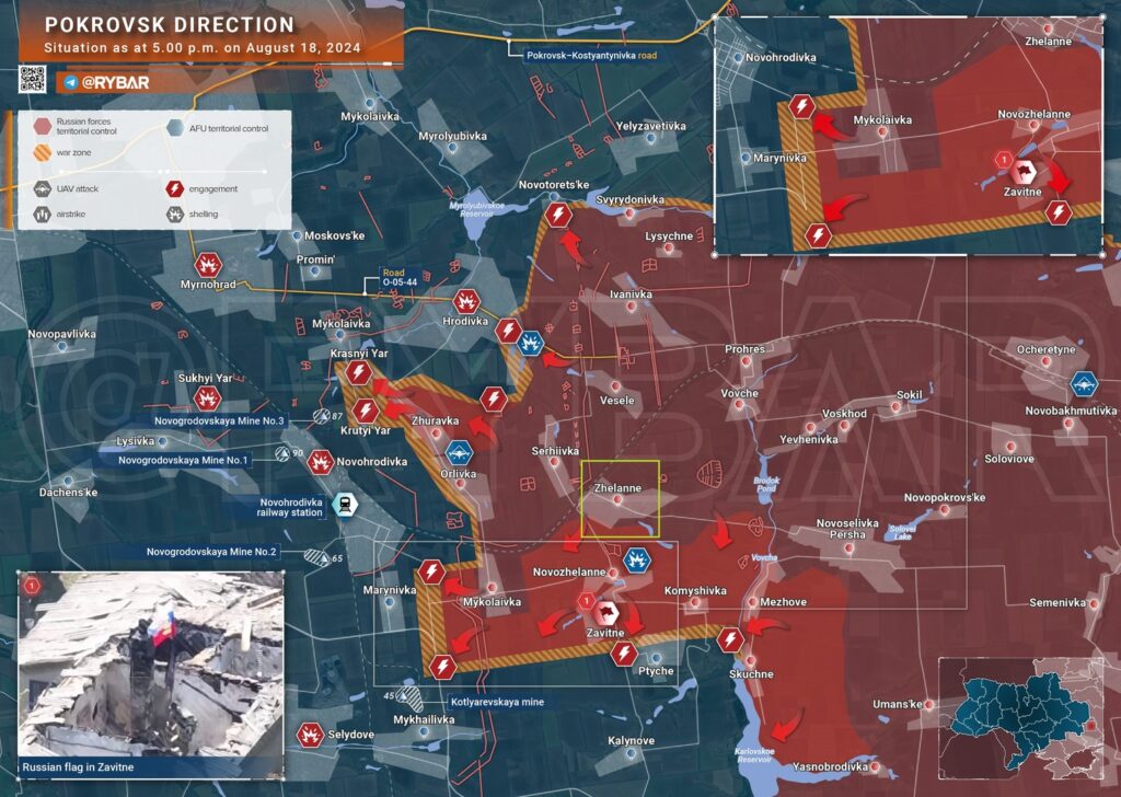 L’épicentre des combats reste dans cette région centrale, démontrant que la Russie ne recule pas. L’ampleur de l’avancée des troupes russes montre également le coût de l’offensive militaire ukrainienne dans la région de Koursk, selon le média russe Rybar. Le ministère russe de la Défense ne confirmera les avancées qu’une fois la situation stabilisée. La crise opérationnelle des forces ukrainiennes dans la direction Pokrovsky s’est aggravée ces dernières semaines, les forces russes élargissant leur zone de contrôle vers Novogrodovka et le réservoir de Karlovskoïé. Des combats sont déjà signalés dans les zones environnantes, démontrant la poussée continue des groupes d’assaut russes.