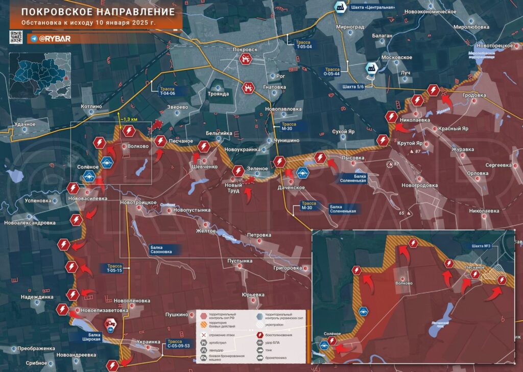 Le 11 janvier, le ministère de la Défense a annoncé la libération du village de Chevtchenko, à quelques kilomètres au sud de la ville de Pokrovsk où progressent les forces russes. Le 18 décembre, le chef d’état-major des forces armées russes, le général Valery Gerasimov, a déclaré que l’armée russe avait pris le contrôle de plus de 4 500 kilomètres carrés et de 190 colonies en 2024. Cette liste s’est depuis allongée.
