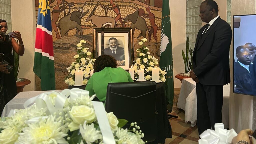 « Permettez-moi de vous demander à tous de baisser la tête. Dieu Créateur, nous vous remercions pour la vie de Sam Nujoma », a déclaré le pasteur, alors que quelques bougies et fleurs entouraient le portrait officiel de Sam Nujoma. Un petit ruban noir près de son visage indiquait le deuil.