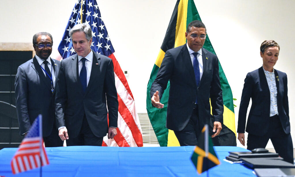Secretary of State Antony Blinken, poses for a photo with Jamaica’s Foreign Minister Kamina Johnson Smith, right, Jamaica’s Prime Minister Andrew Holness and U.S. Ambassador to Jamaica N. Nick Perry, left, during a meeting on Haiti at the Conference of Heads of Government of the Caribbean Community (CARICOM) in Kingston, Jamaica, on Monday, March 11, 2024. (Andrew Caballero-Reynolds, Pool via AP)