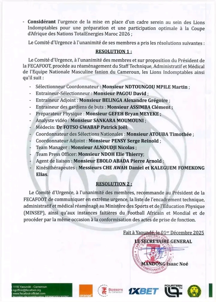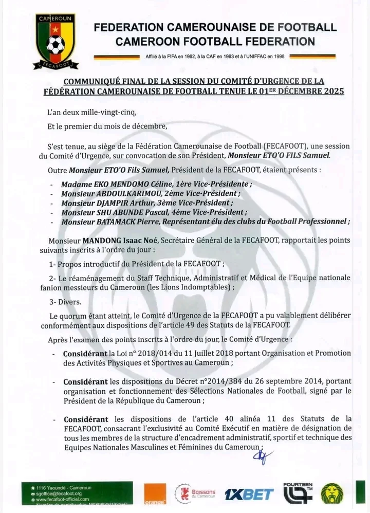 Autant d’éléments qui, selon la fédération, ont « manifestement perturbé les performances » de l’équipe nationale et « largement contribué à la non-qualification du Cameroun pour la Coupe du monde 2026 ».