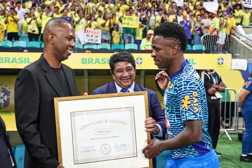 Dans le cadre de la campagne « Raizes de Ouro » de l’institution, le joueur de 24 ans a reçu un certificat d’ascendance. Il a révélé que les ancêtres de « Vini » étaient originaires du Cameroun. La Confédération a collaboré avec une société de traçage génétique et l’attaquant de la Seleçao a dû passer des tests pour déterminer ses origines.